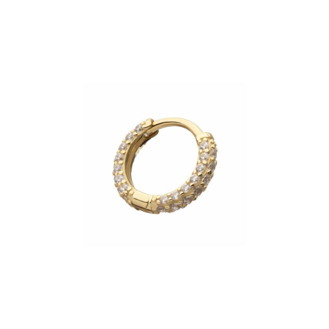 De 14kt gouden clicker met zirkonia is een luxe en tijdloos piercing sieraad, vervaardigd uit 14 karaat massief goud en afgewerkt met een elegante rijen sprankelende steentjes. Dit verfijnde ontwerp combineert minimalisme met een subtiele sparkle, perfect voor een stijlvolle en verzorgde ear setup.